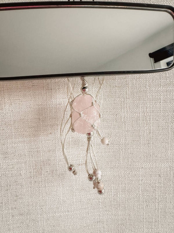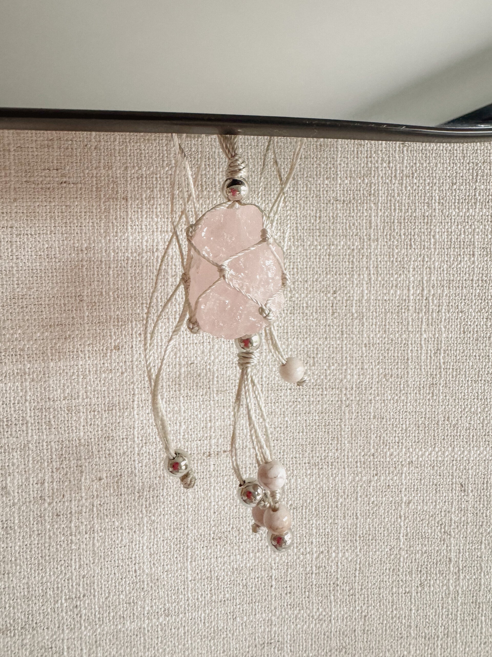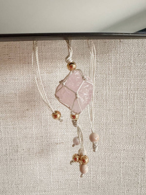 Deze hanger voor aan je achteruitkijkspiegel met rozenkwarts als je onderweg zachtheid en verbinding met jezelf en anderen wilt voelen. Rozenkwarts nodigt uit tot rust, zelfliefde en harmonie, ook als je onderweg bent.