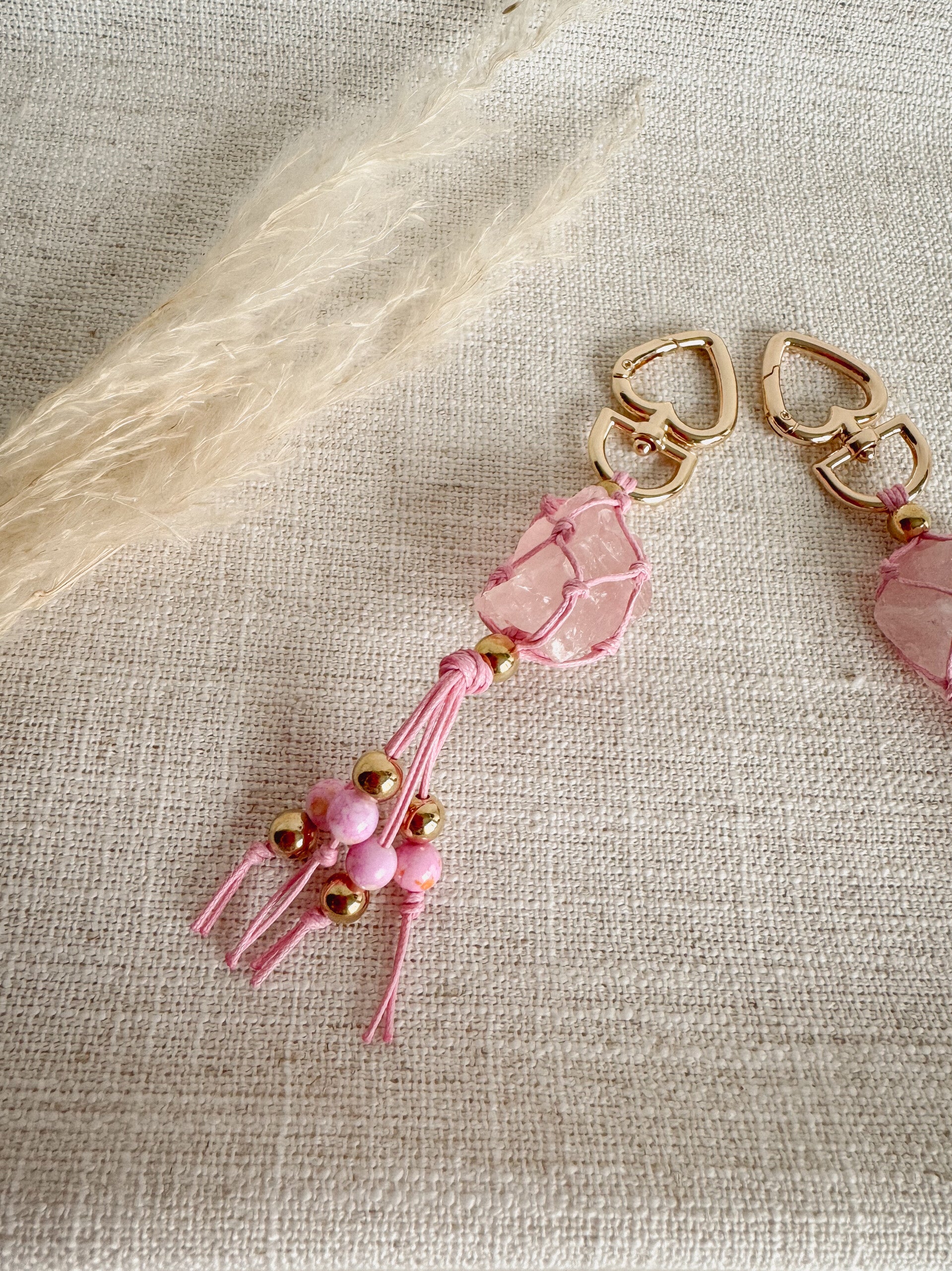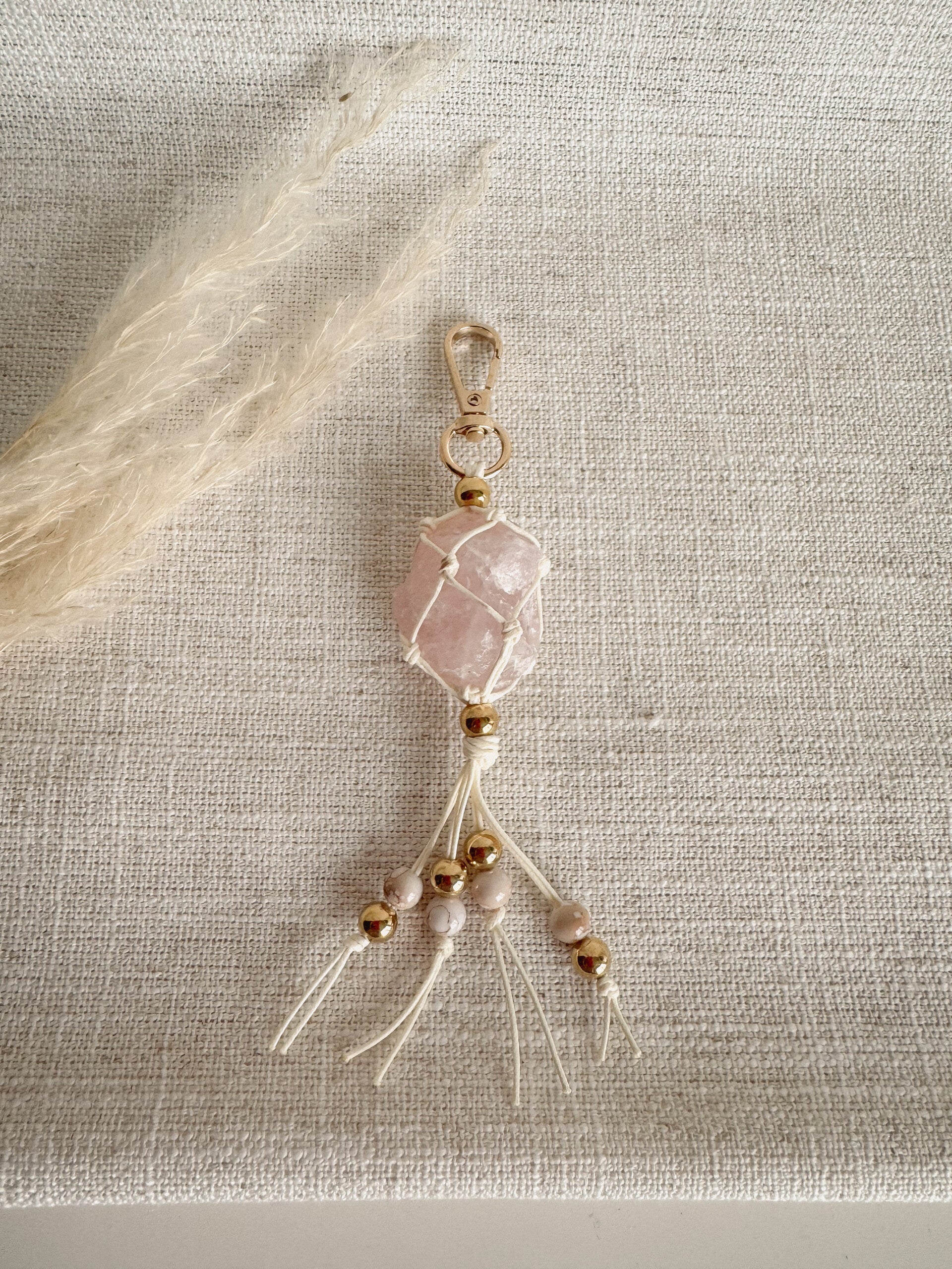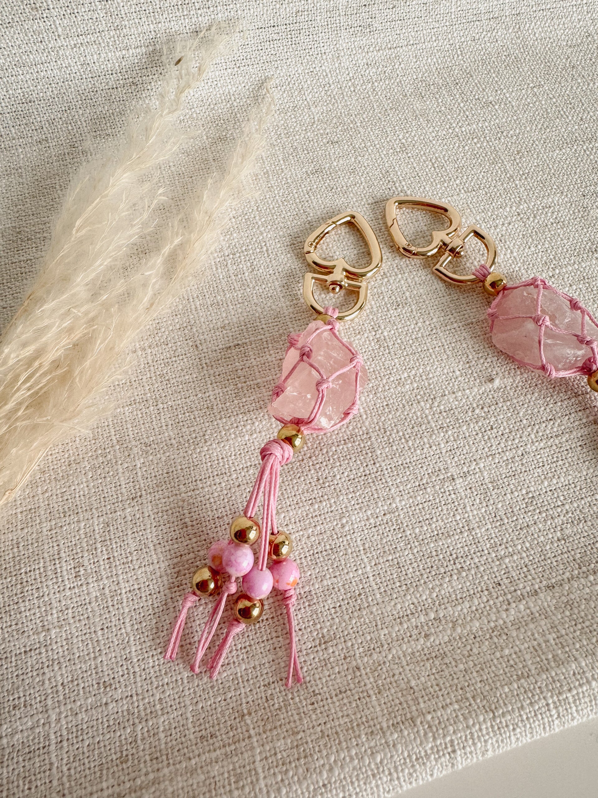 Draag deze sleutelhanger bij je sleutels of tas en voel de zachte kracht van rozenkwarts mee in je dagelijkse ritme.