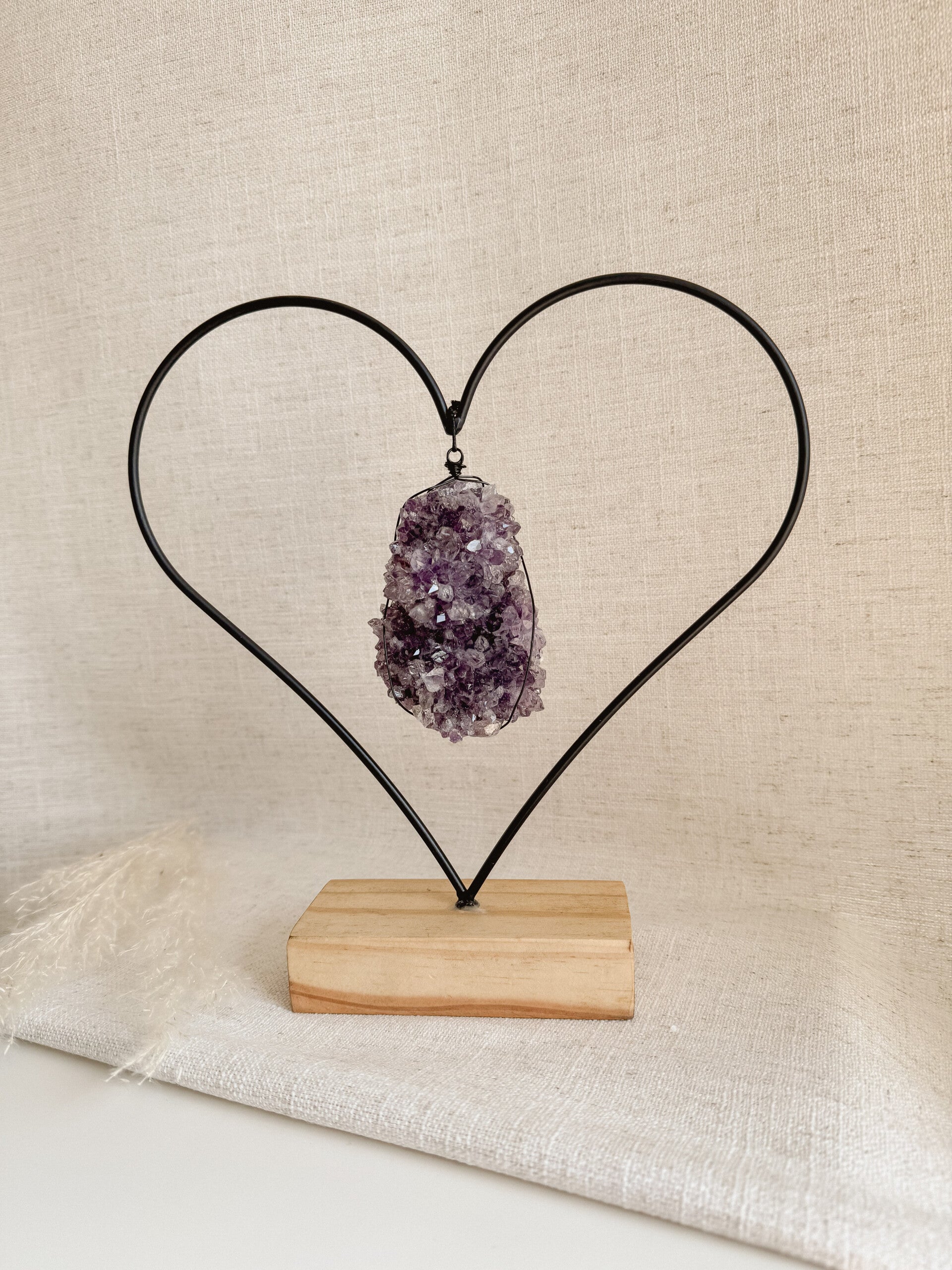 Deze hartvormige houder met amethist is een prachtige combinatie van liefdevolle symboliek en krachtige energie. Amethist staat bekend om haar kalmerende werking en helpt bij het vinden van innerlijke rust en helderheid. De hartvorm versterkt de energie van liefde en harmonie, waardoor dit stuk niet alleen een visuele blikvanger is, maar ook een bron van zachtheid en balans in je ruimte.