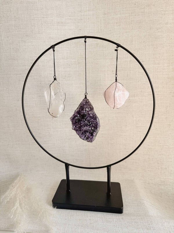 Deze ronde houder draagt de krachtige energie van de gouden driehoek: amethist, rozenkwarts en bergkristal. Samen vormen deze stenen een harmonieuze combinatie die rust, liefde en helderheid in een ruimte brengt. De ronde vorm symboliseert oneindigheid en balans, waardoor dit stuk niet alleen energetisch krachtig is maar ook visueel een warme en uitnodigende uitstraling heeft.