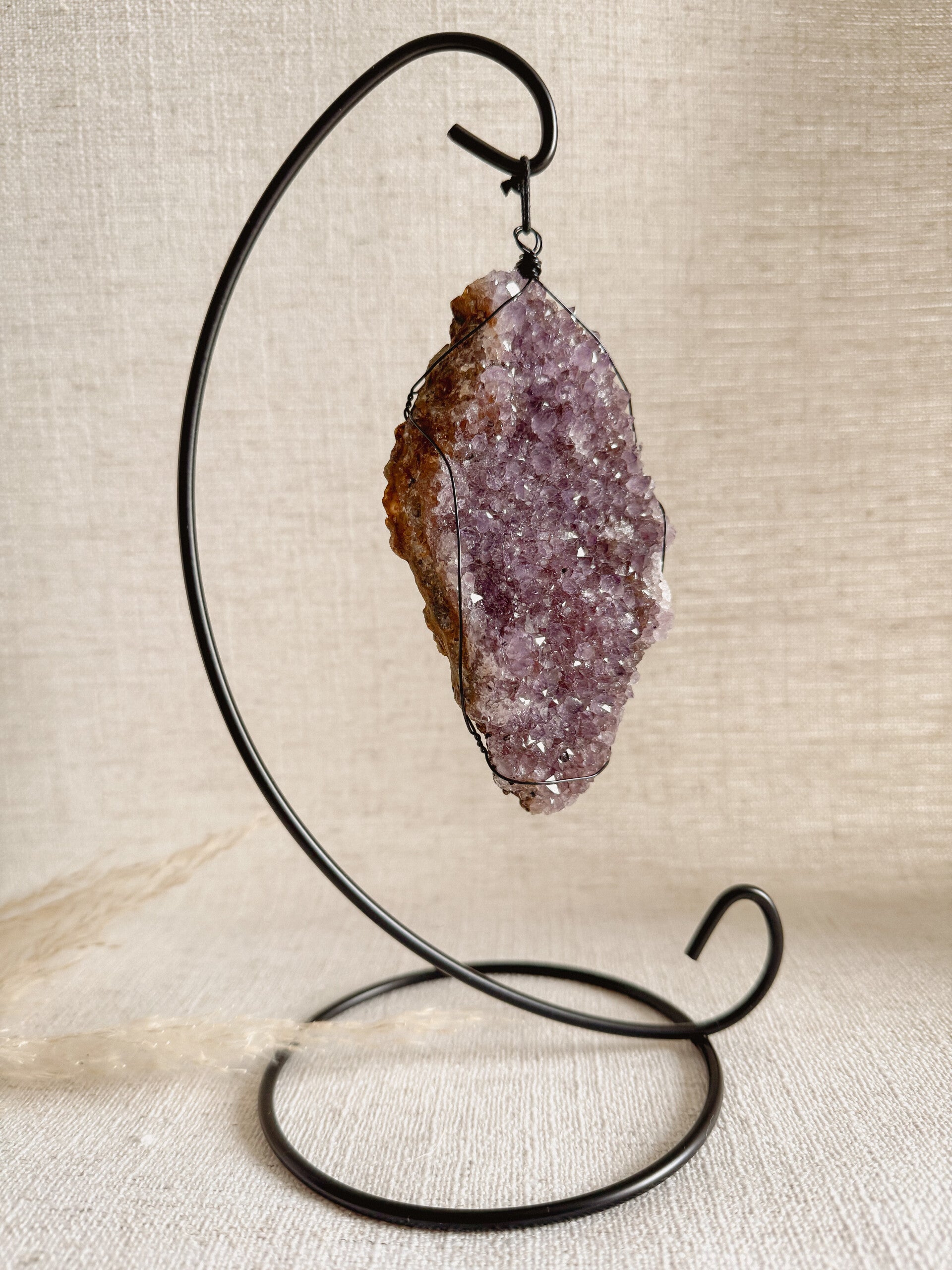 Deze houder met amethist straalt rust en harmonie uit. Amethist staat bekend om haar kalmerende energie en helpt bij het vinden van innerlijke balans en helderheid. Met haar diepe paarse kleur brengt deze steen niet alleen een serene sfeer in je ruimte, maar is ze ook een stijlvolle blikvanger.