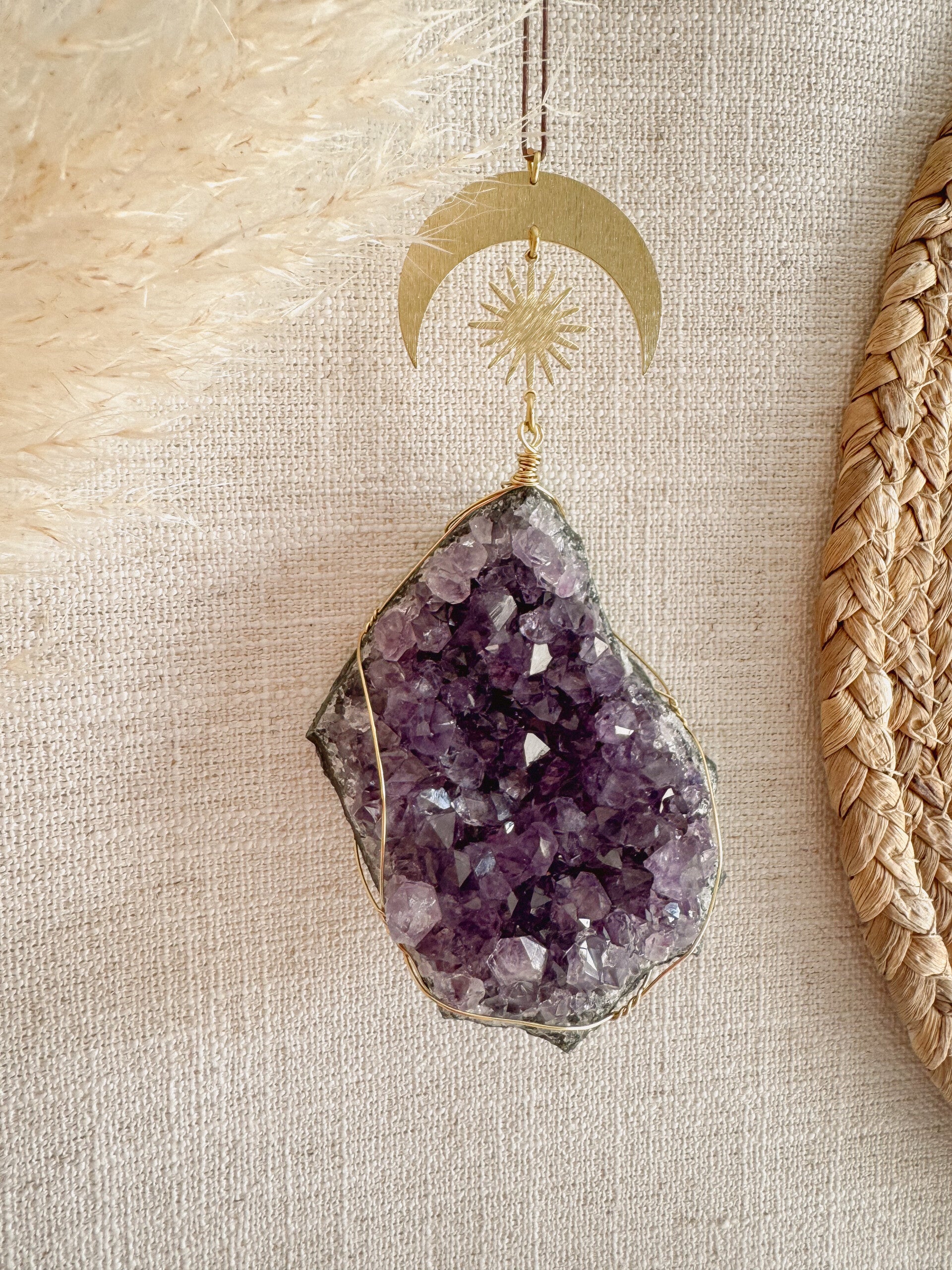 Deze hanger met amethist brengt een zachte, kalmerende energie in je ruimte. Amethist staat bekend om haar rustgevende werking en helpt om balans, helderheid en spirituele verdieping te vinden. De natuurlijke paarse kristallen maken van deze hanger niet alleen een energetisch krachtig stuk, maar ook een prachtige decoratie.