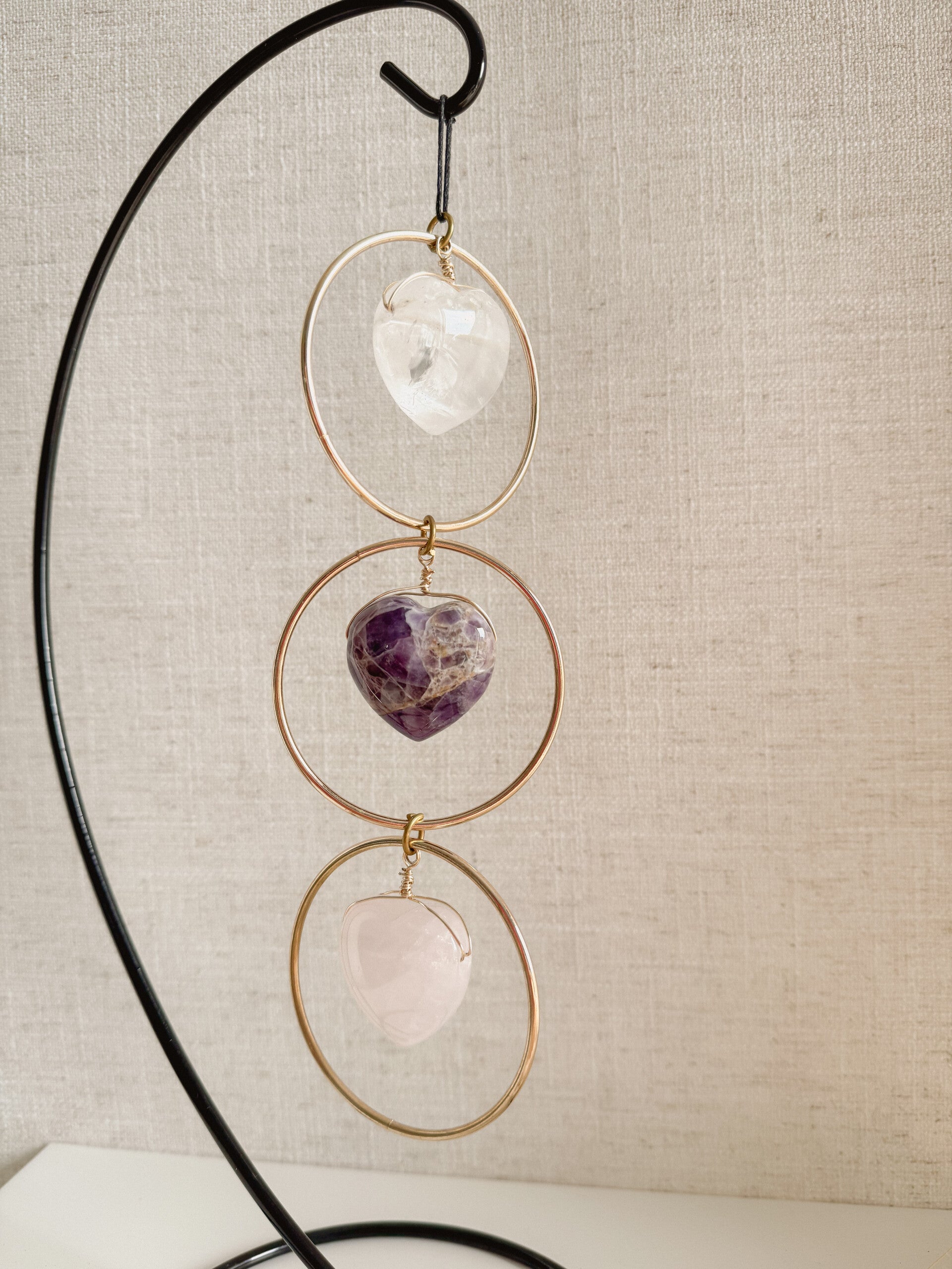 Deze houder draagt de energie van de gouden driehoek: amethist, rozenkwarts en bergkristal, elk in hartvorm. Samen vormen deze stenen een harmonieuze combinatie die rust, liefde en helderheid brengt in je ruimte. De hartvorm versterkt de liefdevolle en beschermende energie, terwijl de houder het geheel een mooie, zichtbare plek geeft.