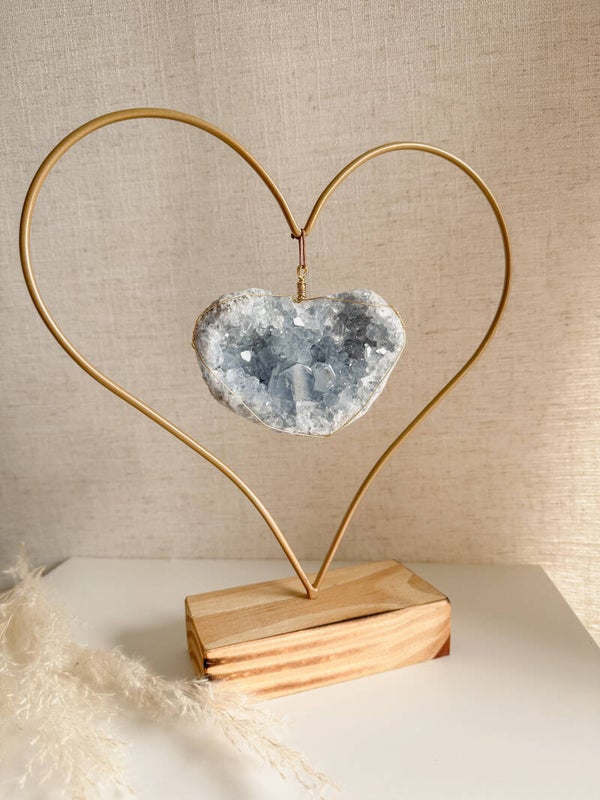 Deze bijzondere houder met een celestien in hartvorm straalt zachtheid, rust en een liefdevolle energie uit. Celestien staat bekend om zijn kalmerende werking en helpt je om innerlijke stilte te vinden en je te verbinden met hogere energieën. De subtiele hartvorm benadrukt de zachte en liefdevolle vibratie van deze steen.