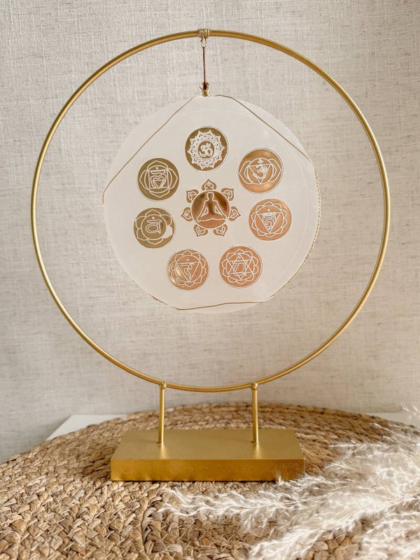 Deze elegante houder bevat een seleniet schijf waarop de zeven chakra’s in goud zijn afgebeeld. Seleniet staat bekend om zijn zuiverende en kalmerende werking en helpt energie in balans te brengen. De gouden chakra-symbolen versterken de harmonieuze energie en herinneren je eraan om verbinding te maken met lichaam en geest.