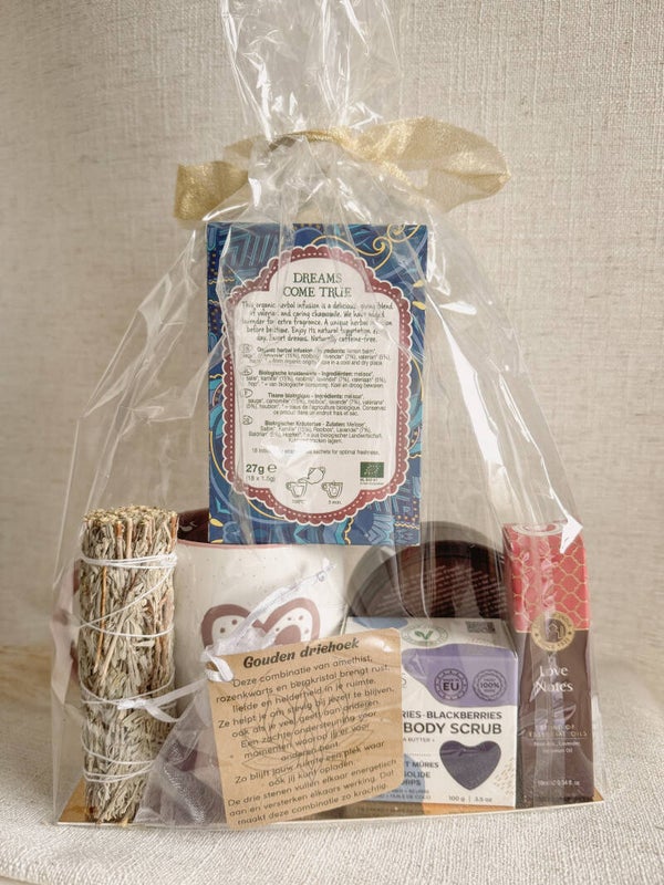 Dit pakket helpt je om bewust even pauze te nemen. Een kop thee, een zachte geur en een klein verzorgmoment brengen je terug uit je hoofd en in het nu. Gewoon even vertragen, zonder iets te moeten.