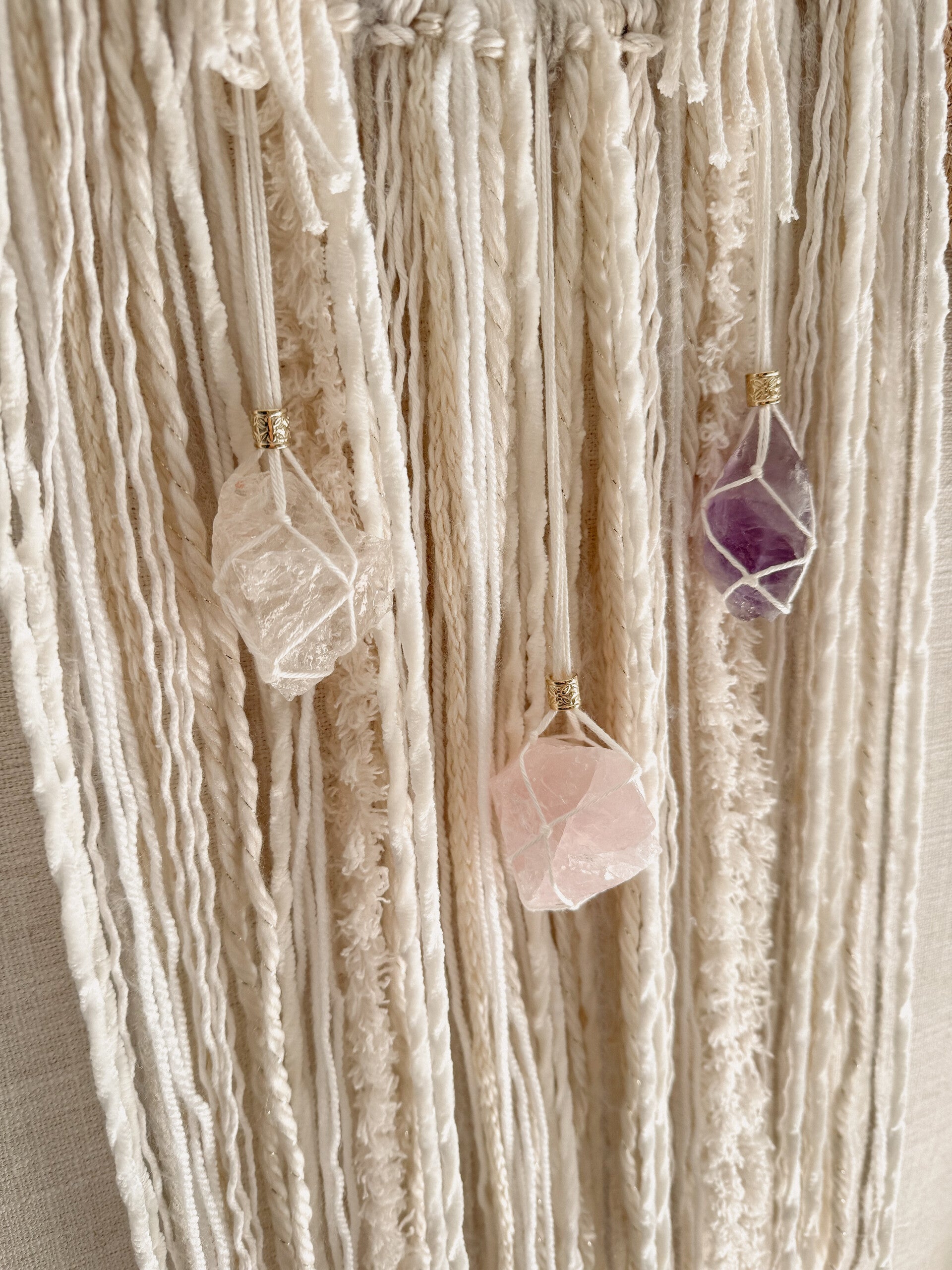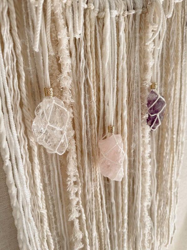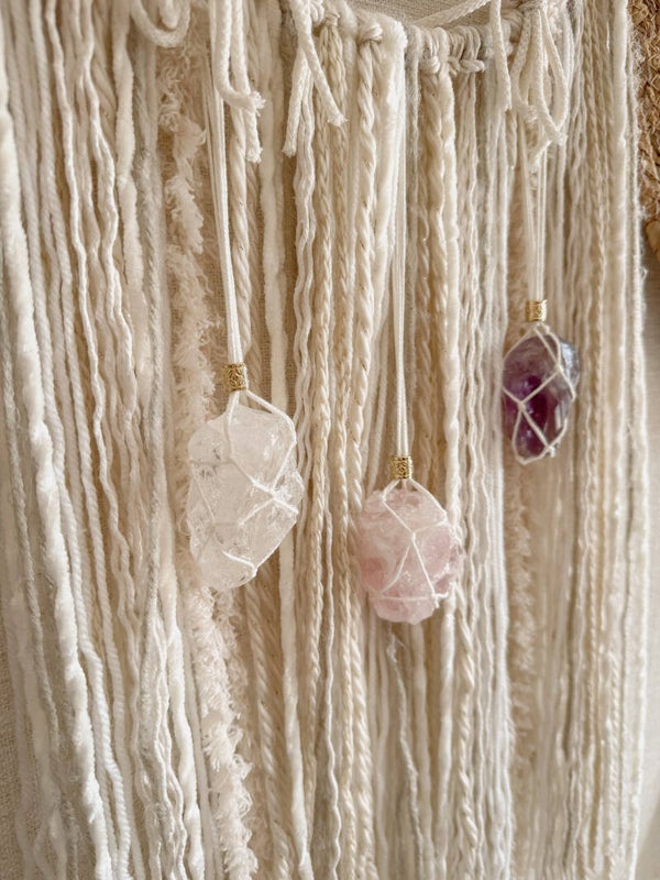 Deze macramé dromenvanger met de Gouden Driehoek brengt rust, helderheid en een gevoel van zachtheid in je ruimte. De combinatie van bergkristal, amethist en rozenkwarts zorgt voor een natuurlijke balans tussen hoofd en hart.