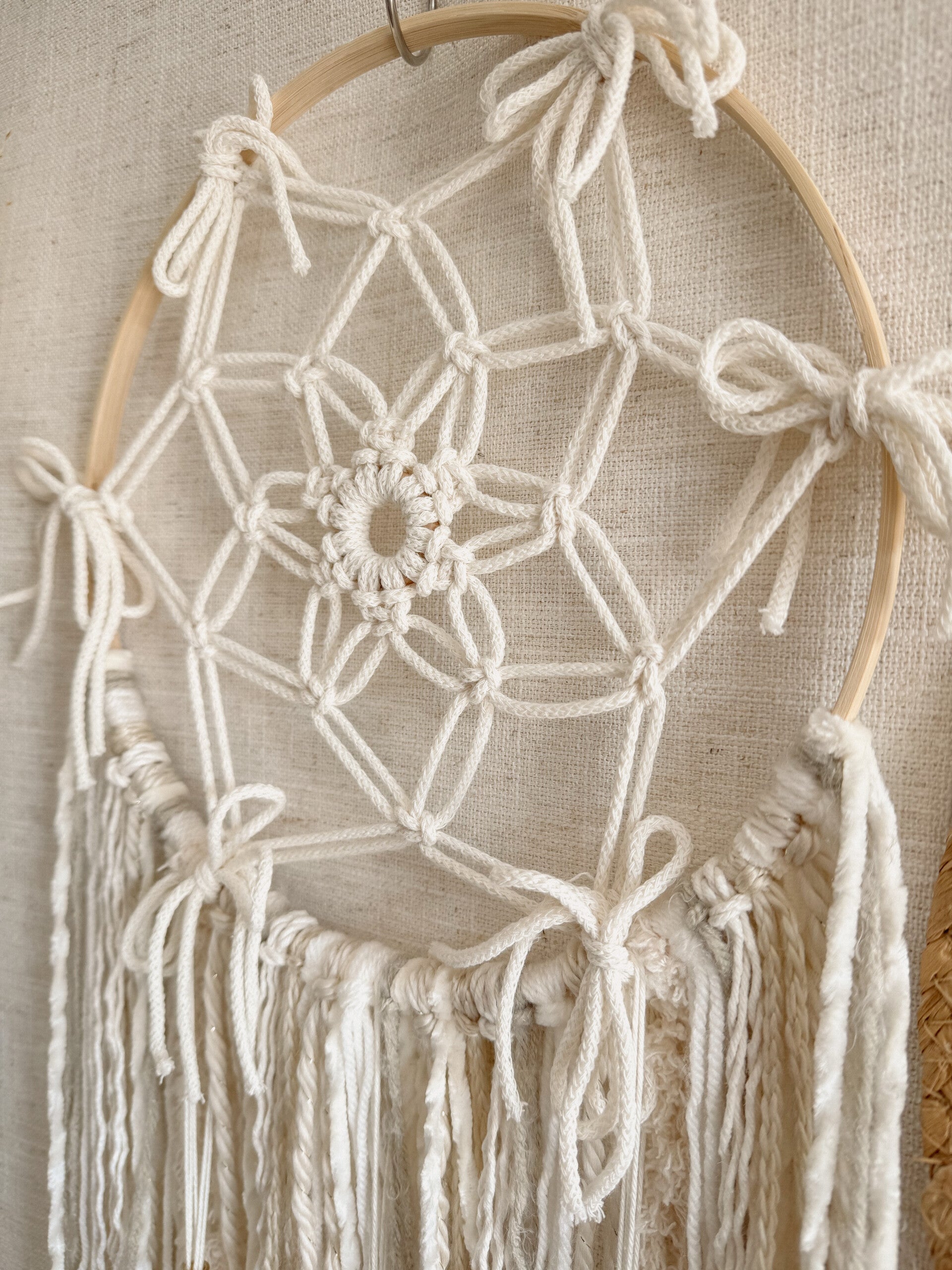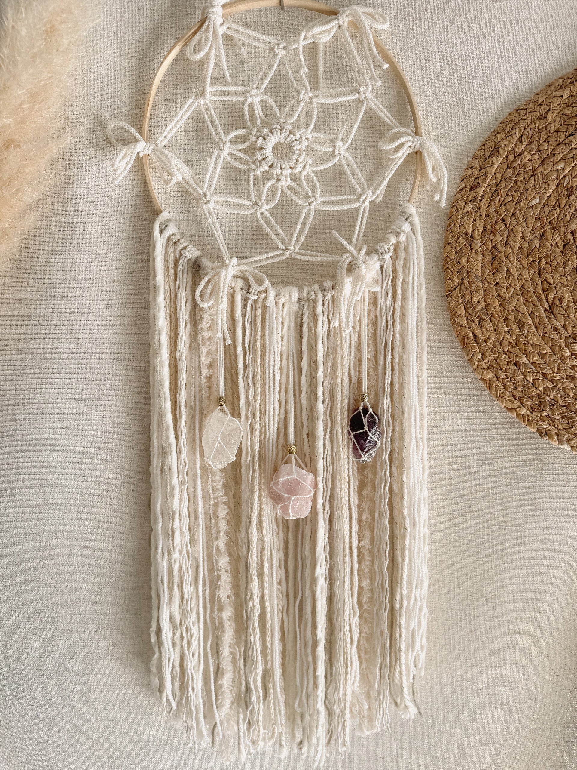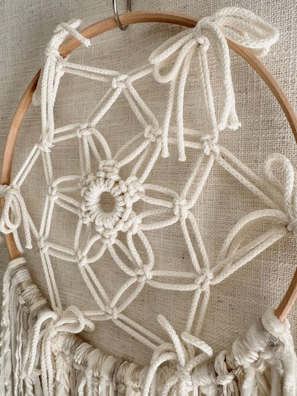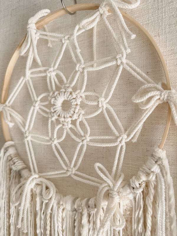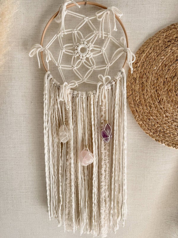 De handgeknoopte macramé geeft de dromenvanger een lichte, serene uitstraling. Mooi om op te hangen in een praktijkruimte, slaapkamer of stille hoek in huis. Overal waar je een kalme en harmonieuze sfeer wilt creëren.
