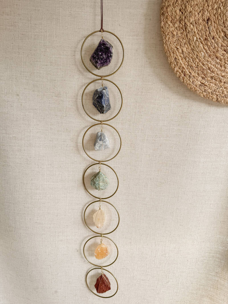 Een hanger met zachte, kleurrijke steentjes die balans en harmonie in een kamer brengen. Ook gewoon een fijn stuk om een lege hoek of wand net dat beetje extra te geven.